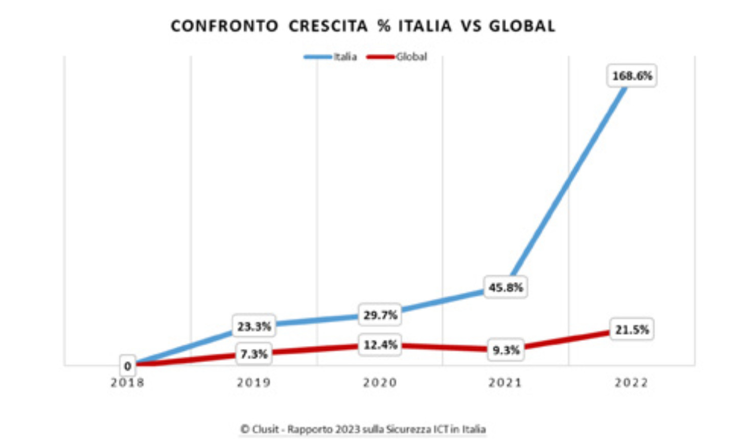 Se nel 2022, infatti, gli attacchi informatici per gli altri paesi sono aumentati mediamente “solo” del 21%…