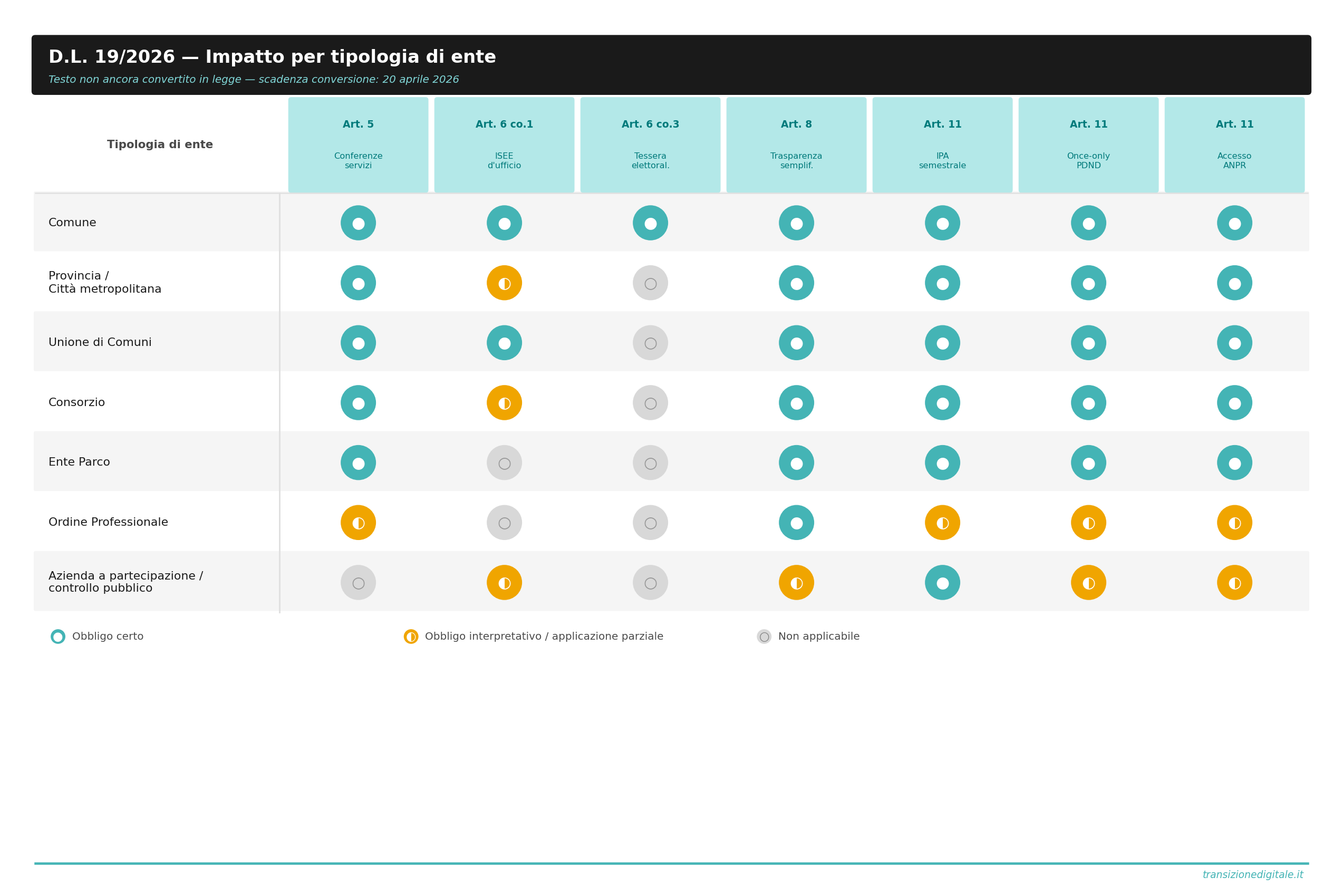 Per ogni articolo del decreto abbiamo distinto tra obblighi certi (testo cogente, sanzioni espresse, scadenza definita), obblighi interpretativi (zone grigie, dipendenza da decreti attuativi non ancora adottati) e semplici modalità operative.
