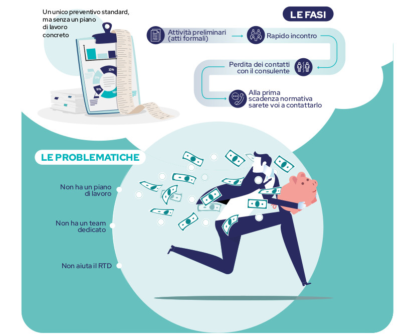 E’ solitamente corredato di attività preliminari semplici (come il controllo delle nomine o degli atti “formali”) e un breve incontro, al termine del quale il consulente di turno si dileguerà nel nulla.